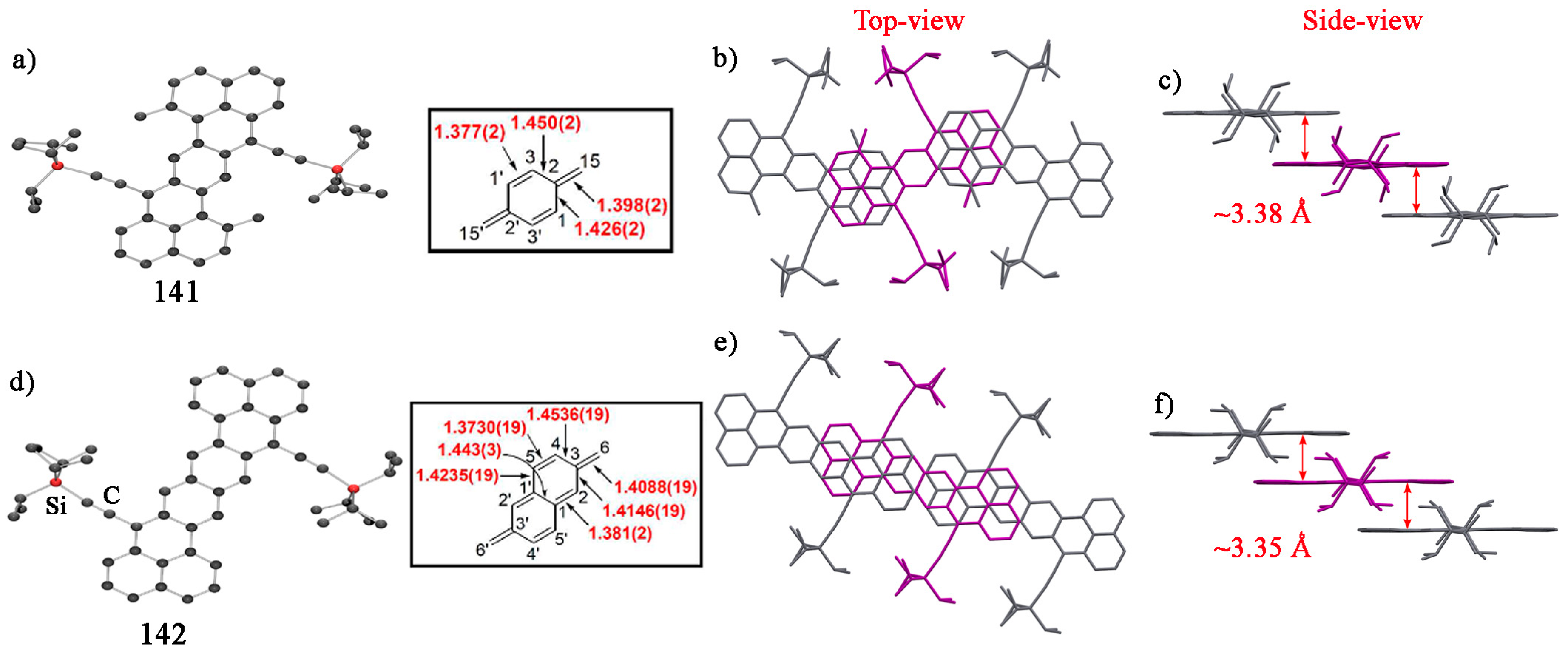 A view of the unit cell of 114 down the b-axis (left) and π-stacks of 114 at 4 K (middle) and depiction of the supramolecular contacts and the interplanar distances in pairs I–II and II–III at 75 K (right). H atoms have been removed for clarity. Reproduced from Reference [147]. Copyright 2014, American Chemical Society.
