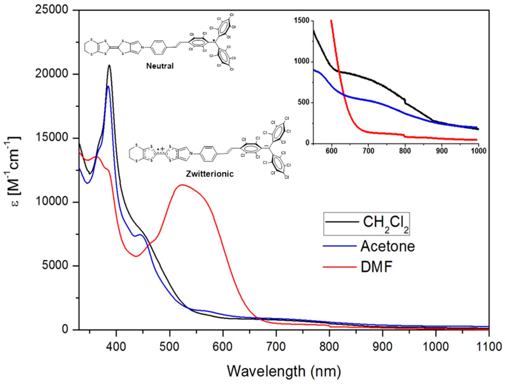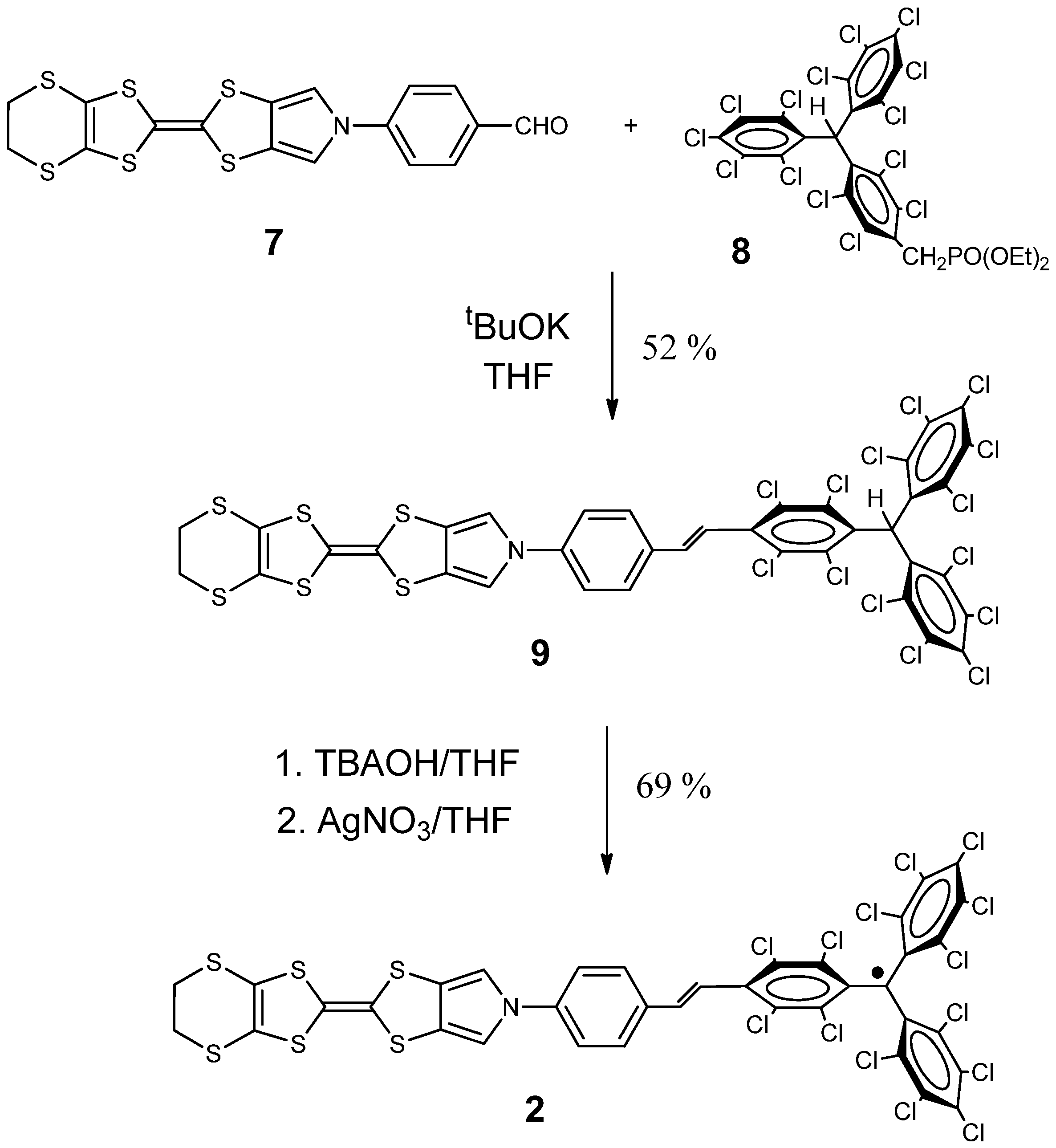 - Souto, M.; Solano, M.V.; Jensen, M.; Bendixen, D.; Delchiaro, F.; Girlando, A.; Painelli, A.; Jeppesen, J.O.; Rovira, C.; Ratera, I.; et al. Self-Assembled Architectures with Segregated Donor and Acceptor Units of a Dyad Based on a Monopyrrolo-Annulated TTF-PTM Radical. Chem. Eur. J. 2015, 21, 8816–8825. [Google Scholar] [CrossRef] [PubMed]