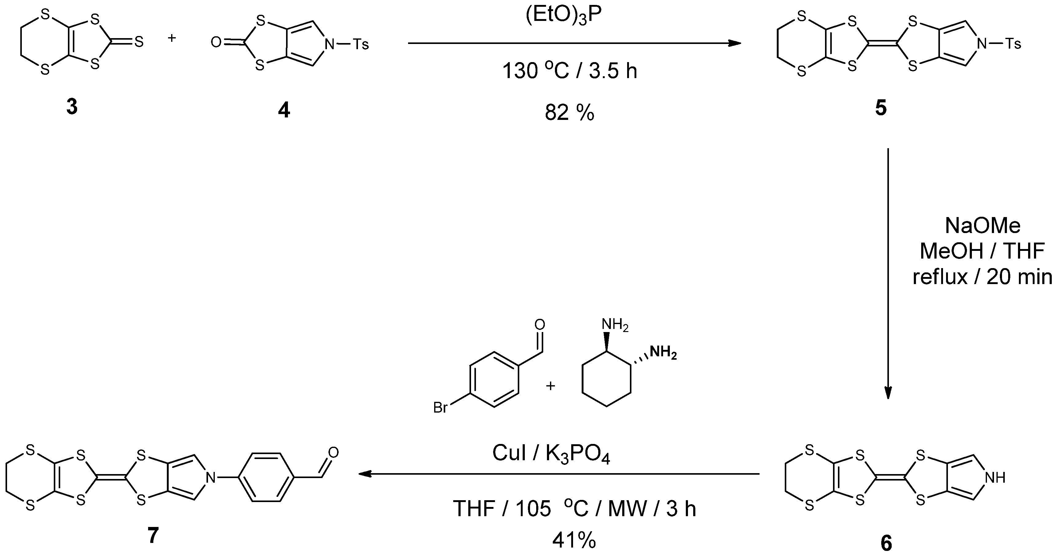 - O’Driscoll, L.J.; Andersen, S.S.; Solano, M.V.; Bendixen, D.; Jensen, M.; Duedal, T.; Lycoops, J.; Van Der Pol, C.; Sørensen, R.E.; Larsen, K.R.; et al. Advances in the synthesis of functionalised pyrrolotetrathiafulvalenes. Beilstein J. Org. Chem. 2015, 11, 1112–1122. [Google Scholar] [CrossRef] [PubMed]