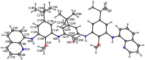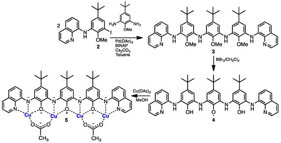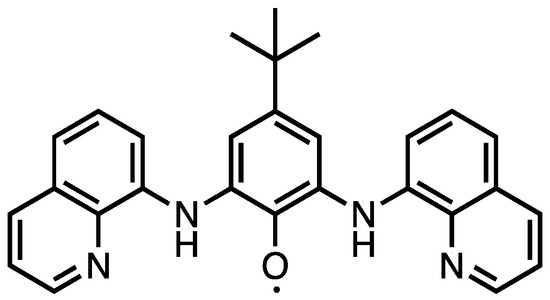 The paramagnetic phenoxyl ligand 4 is prepared in five steps from 4-tert-butylphenol. Iodination, protection of the phenol, and Buchwald-Hartwig cross-coupling [13] with one equivalent of 8-aminoquinoline afforded mono-iodosubstituted 2. Two equivalents of 2 were reacted with commercially available 2,6-diamino-4-tert-butylanisole to produce the tri-methoxy protected 3 (Scheme 1; Figures S1–S4). Crystals of 3 suitable for X-ray crystallography were obtained from the slow diffusion of water into a THF solution of 3. The molecular structure of 3 is presented in Figure 2 with crystallographic and metrical properties reported in Tables S1 and S2. In the crystal structure of 3 there are three independent molecules, one of which is shown in Figure 2 (the structures of the other two independent molecules of 3 can be found in Supplementary Materials Figure S5). In the structure of 3, the contiguous inner three phenyl rings are out-of-plane with respect to one another, with the central ring tilted with respect to the plane containing the two adjacent rings (the structural properties of the two other independent molecules are similar). In Figure 2, the dihedral angle between the central and adjacent phenyl rings is 49.9(2)° and between the central phenyl ring and the quinoline ring is 16.9(2)°.