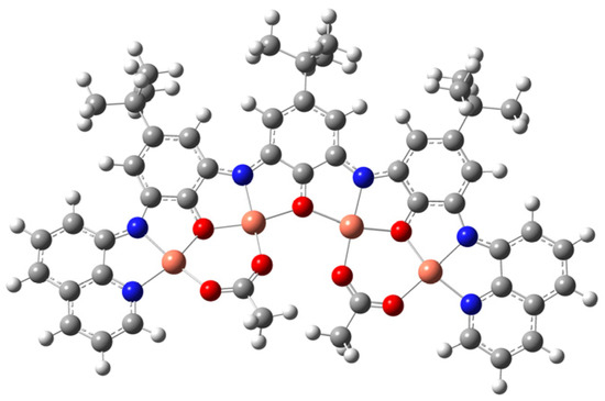 Geometry optimized structure of 5 [BP-86/def2-SVP]. Cu = gold spheres; N = blue spheres; O = red spheres; C = grey spheres; H = white spheres.