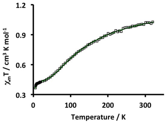 Plot of χmT vs. T for 5. Squares represent the experimental data points and the green curve represents the best fit to the experimental data (best fit parameters are provided in the text). External field 5000 Oe.