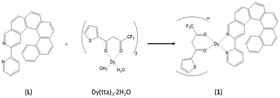 Complex 1 was obtained by the coordination reaction of the chiral 3-(2-pyridyl)-4-aza[6]-helicene [39,40] ligand (L) and tris(2-thenoyltrifluoroaacetonate)bis(aqueous)DyIII in CH2Cl2 (Scheme 1).