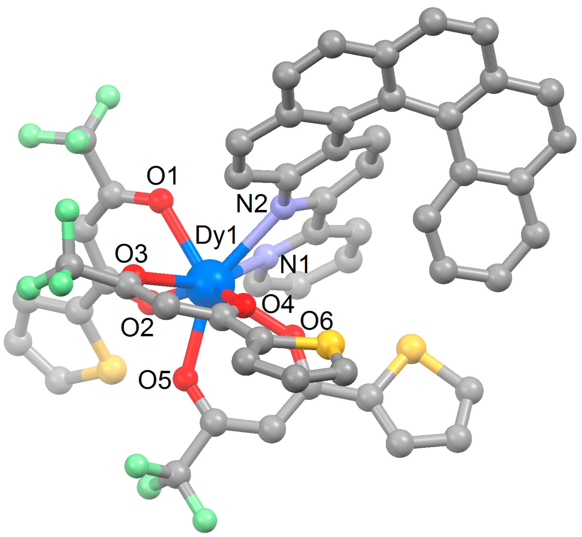 Complex 1 was obtained by the coordination reaction of the chiral 3-(2-pyridyl)-4-aza[6]-helicene [39,40] ligand (L) and tris(2-thenoyltrifluoroaacetonate)bis(aqueous)DyIII in CH2Cl2 (Scheme 1).