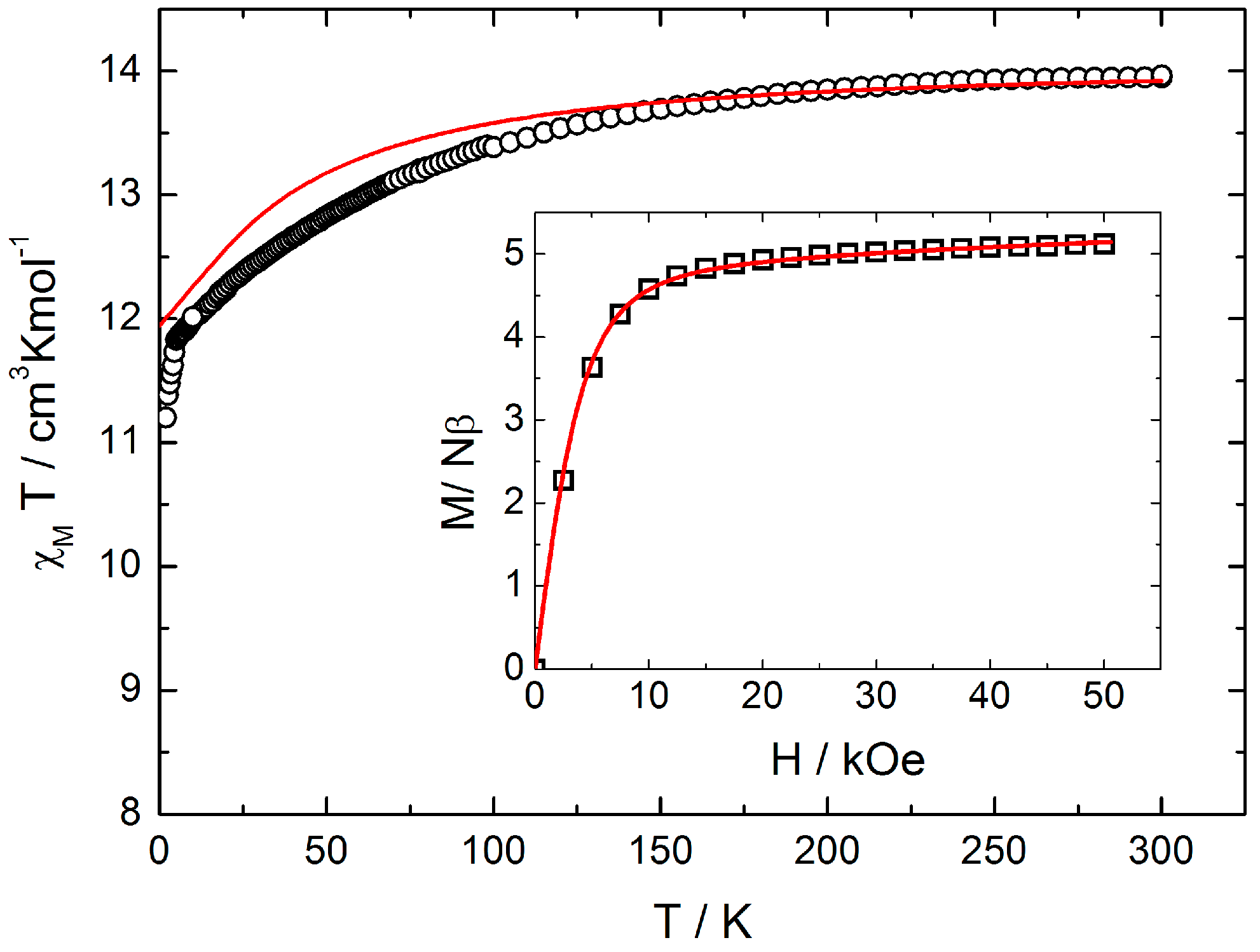 Temperature dependence of χMT for 1 (black circles). The inset shows the field variations of the magnetization at 2 K. Full red lines correspond to the simulated curves from ab initio calculations.