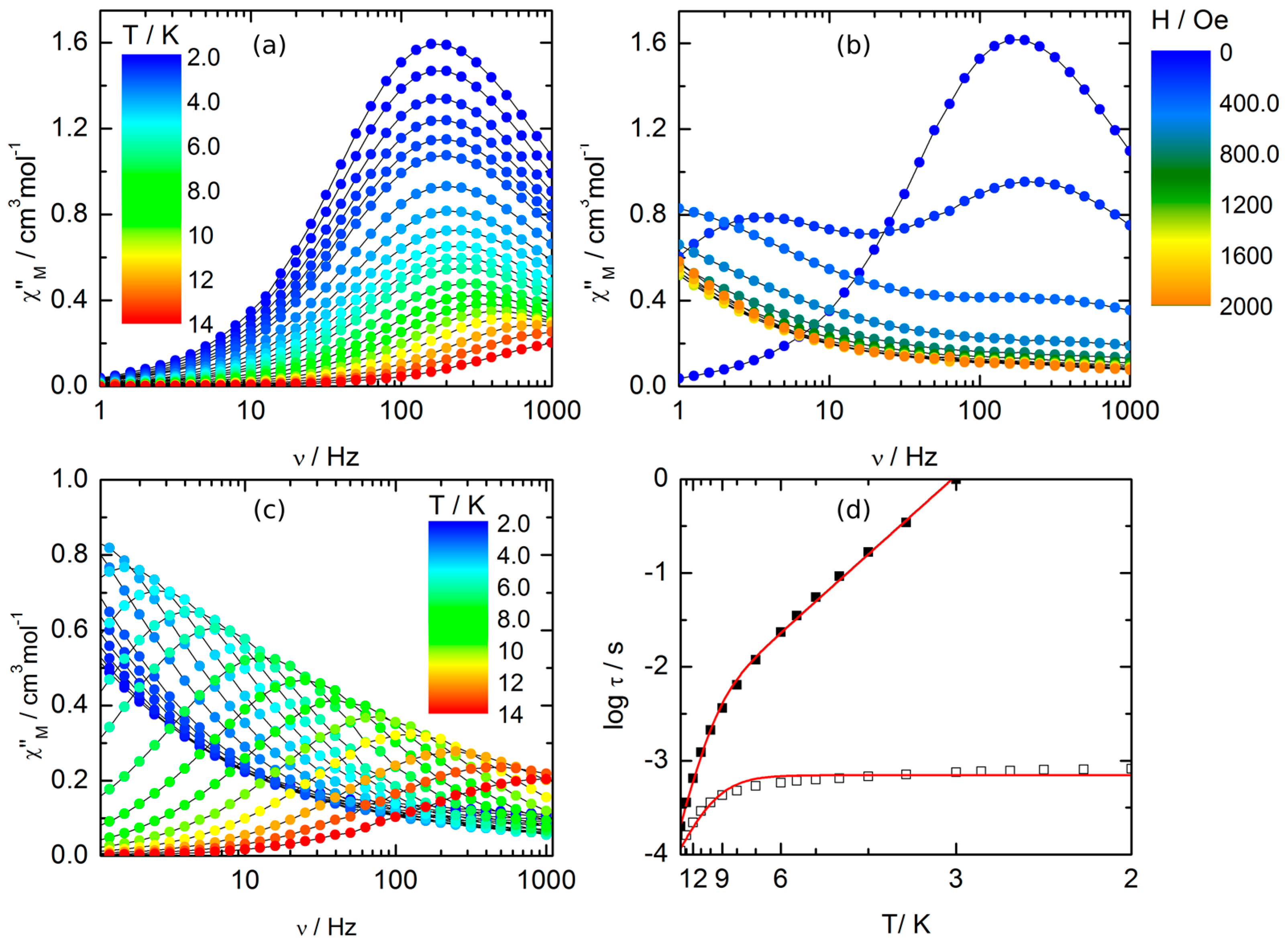 (a) Frequency dependence of χM′′ between 2 and 14 K; (b) scan field of the frequency dependence of χM′′ at 2 K; (c) frequency dependence of χM′′ between 2 and 14 K under an applied magnetic field of 1000 Oe; and (d) temperature variation of the relaxation time measured in zero field (open squares) and in an external field of 1000 Oe (full squares) with the best fitted curve (red lines) in the temperature range of 2–14 K.