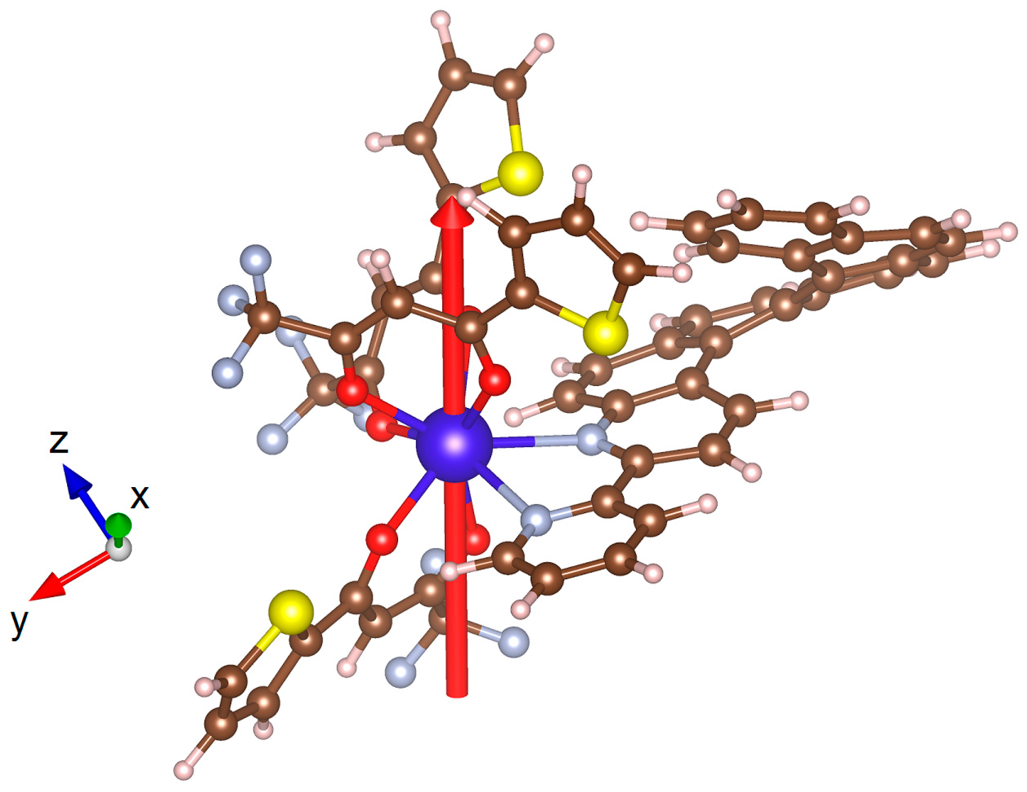 Calculations were performed for 1 to understand the observed magnetic properties comparing with the ab initio calculated electronic structure (see computational details). The calculated χMT vs. T and M vs. H (Figure 3) curves fairly well reproduce the experimental curves, even if the agreement for the χMT vs. T data is still semi-quantitative. Calculations confirm the axial character of the magnetic anisotropy tensor of the ground Kramers doublet with large gz values of 19.55 and almost negligible gx and gy values. The gz value for DyIII is close to the expected gz = 20 for a pure MJ = |±15/2> ground state. This is confirmed by the calculated composition of MJ = 0.94 |±15/2> + 0.06 |±11/2> for the ground doublet state of 1 (see Table S5 for the wavefunction composition). The calculated ground-state easy axis (Figure 6) for the DyIII ion is oriented perpendicular to the plane formed by the 2,2′-bipyridine moieties as expected for an oblate ion with this coordination sphere [31,36].