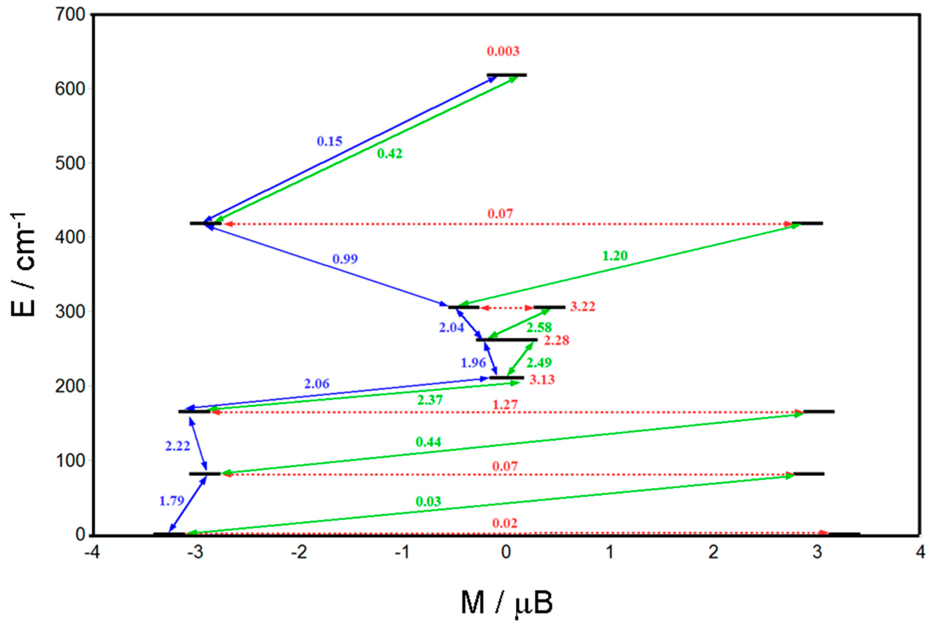 Even if the uniaxiality of the anisotropy is not strictly associated to slow relaxation of the magnetization [46], in most of the cases reported in the literature for DyIII this assumption is valid. Indeed, in this case, the magnetic relaxation pathways can also be easily interpreted on the basis of magnetic transition moments (Figure 7) calculated with the SINGLE_ANISO program [47,48]. It has to be pointed out that in the latter not all the contributions are included. Indeed, the coupling of spin-phonon degrees of freedom in the SMM relaxation is not taken into account in the ab initio model whereas it has been recently evidenced of general importance [49,50]. However, these discrepancies are common in literature [3,51,52] and the magnetic transition moments calculated in this work still leads to a fairly good qualitative picture. Indeed, no direct transition between the two MJ states of the ground doublet or Orbach processes from the ground state are expected whereas relaxation mechanisms involving states from the third MJ state are highly probable. A non-negligible Orbach process has been also found between the second and third MJ states. The calculations indicate a difference between the calculated energy barrier (Δ = 82 cm−1) and the experimental barrier (Δ = 39–68 cm−1). However, the discrepancy between these values can be, reasonably, ascribed in the spin-phonon contributions mentioned above.