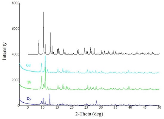 Experimental X-ray diffraction patterns of complexes 2 (cyan), 3 (green) and 4 (blue), and the theoretical pattern for complex 2 (black).