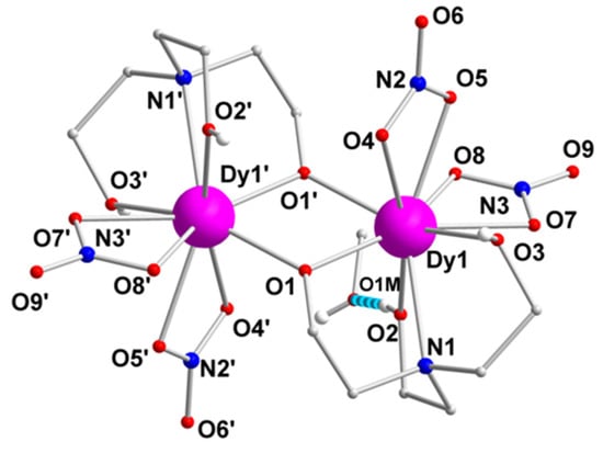 Dinuclear complexes represent the simplest molecular entities which allow the study of magnetic interactions between LnIII spin carriers []. By studying such systems, researchers could expect to understand the nature and strength of LnIII··· LnIII exchange interactions, as well as possible alignment of spin vectors and anisotropy axes. These parameters can be affected by the molecular symmetry, the coordination geometry and/or the bridging ligands, which may act as superexchange pathways. More importantly, dinuclear LnIII SMMs are very important model systems to answer basic questions regarding single-ion relaxation vs. slow magnetic relaxation arising from the molecule as an entity. Thus, LnIII2 complexes are highly desirable [,,,,,,,,,,]. Another interesting area to which dinuclear lanthanide(III) complexes (and also mononuclear ones) are relevant is quantum computation; LnIII ions are promising candidates for encoding quantum information [,]. For the realization of a quantum gate, asymmetric dinuclear molecules composed of two weakly coupled LnIII qubits are promising []. However, the synthesis of asymmetric molecular dimers is not straightforward, as nature tends to make them symmetric. From the synthetic inorganic chemistry viewpoint, the most logical simple route for the isolation of dinuclear 4f-metal ion complexes is the simultaneous employment of bidentate bridging anionic groups (e.g., η1:η1:μ2 and/or η1:η2:μ2 carboxylate groups) and chelating (most often bidentate or tridentate, e.g. bpy, phen, terpy, etc.) neutral capping organic ligands, which terminate oligomerization or polymerization by blocking two or three coordination sites per LnIII center []. Another method is the simultaneous employment of capping bidentate nitrato groups (nitrato ligands have little tendency for bridging in LnIII chemistry) and neutral or anionic organic ligands that can, in principle, bridge only two metal centers; in addition to the bridging functionality, the ligands should preferably possess “chelating” parts to satisfy the demand for high coordination numbers at the LnIII centers [,,]. Thus, the choice of the primary organic ligands is crucial for the synthesis of LnIII2 complexes.