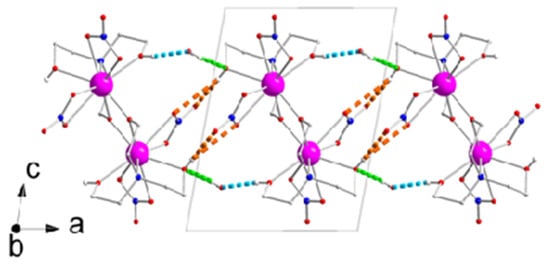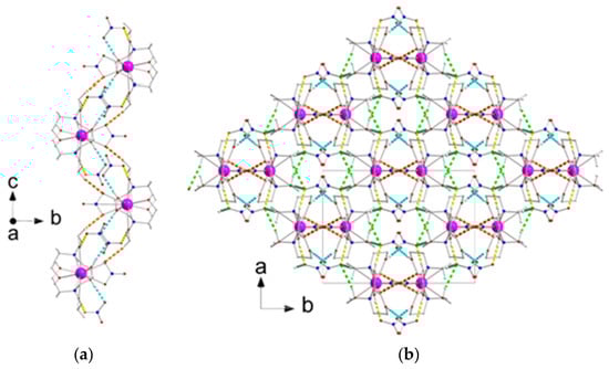 (a) Chains of [Pr(NO3)(teaH3)2]2+ cations and NO3− counterions parallel to the c axis in the crystal structure of 6. (b) 3D arrangement of chains in the crystal structure of 6. The thick dashed lines represent the C3–HB(C3)···O4 (orange), O1–H(O1)···O6 (cyan), O2–H(O2)···O8 (yellow), O3–H(O3)···O8 (dark green) and C6–HA(C6)···O8 (light green) H bonds.