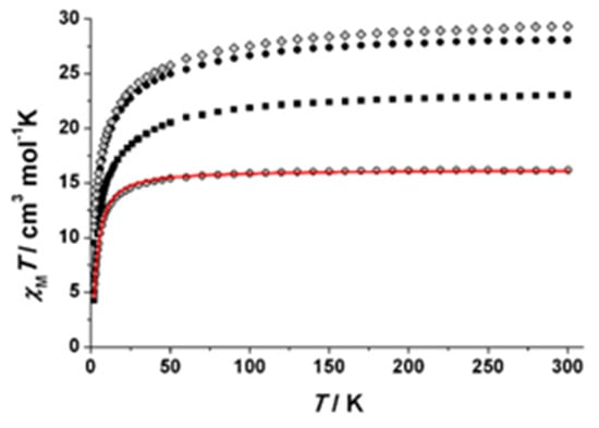 Direct current (dc) magnetic susceptibility data (χΜ) on dried polycrystalline, analytically pure samples of 2–5 were collected in the 2.0–300 K range. The data are plotted as χΜT vs. T products in Figure 6. The strength of the magnetic interactions between the two LnIII ions in the dinuclear complexes can be easily quantified with the gadolinium analog 2. Indeed, the GdIII ions present no spin-orbit coupling at the first order. Thus, the decrease or increase of the χΜT product when lowering the temperature for 2 reveals directly the presence of an antiferromagnetic or ferromagnetic, respectively, interaction between the GdIII centers. The room temperature χΜT value for 2 is 16.10 cm3∙K∙mol−1, essentially equal to the spin-only value (15.75 cm3∙K∙mol−1) expected for two non-interacting GdIII (8S7/2, S = 7/2, L = 0, g = 2) ions. The value of the χΜT product remains almost constant down to ~40 K and then decreases rapidly to 4.64 cm3∙K∙mol−1 at 2.0 K, suggesting an antiferromagnetic exchange interaction. Fit of the experimental data was performed by means of the conventional analytical expression derived from the isotropic spin Hamiltonian shown in Equation (3).