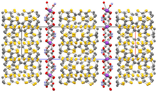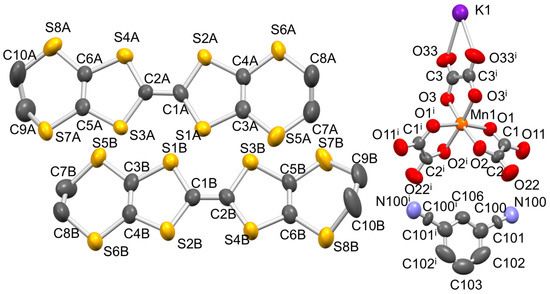 The crystal structure consists of alternating layers of ET molecules adopting the pseudo-κ phase and anionic layers containing [Mn(C2O4)3]3− anions, K+ cations and the guest benzonitrile molecule (Figure 2).