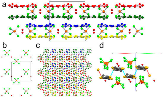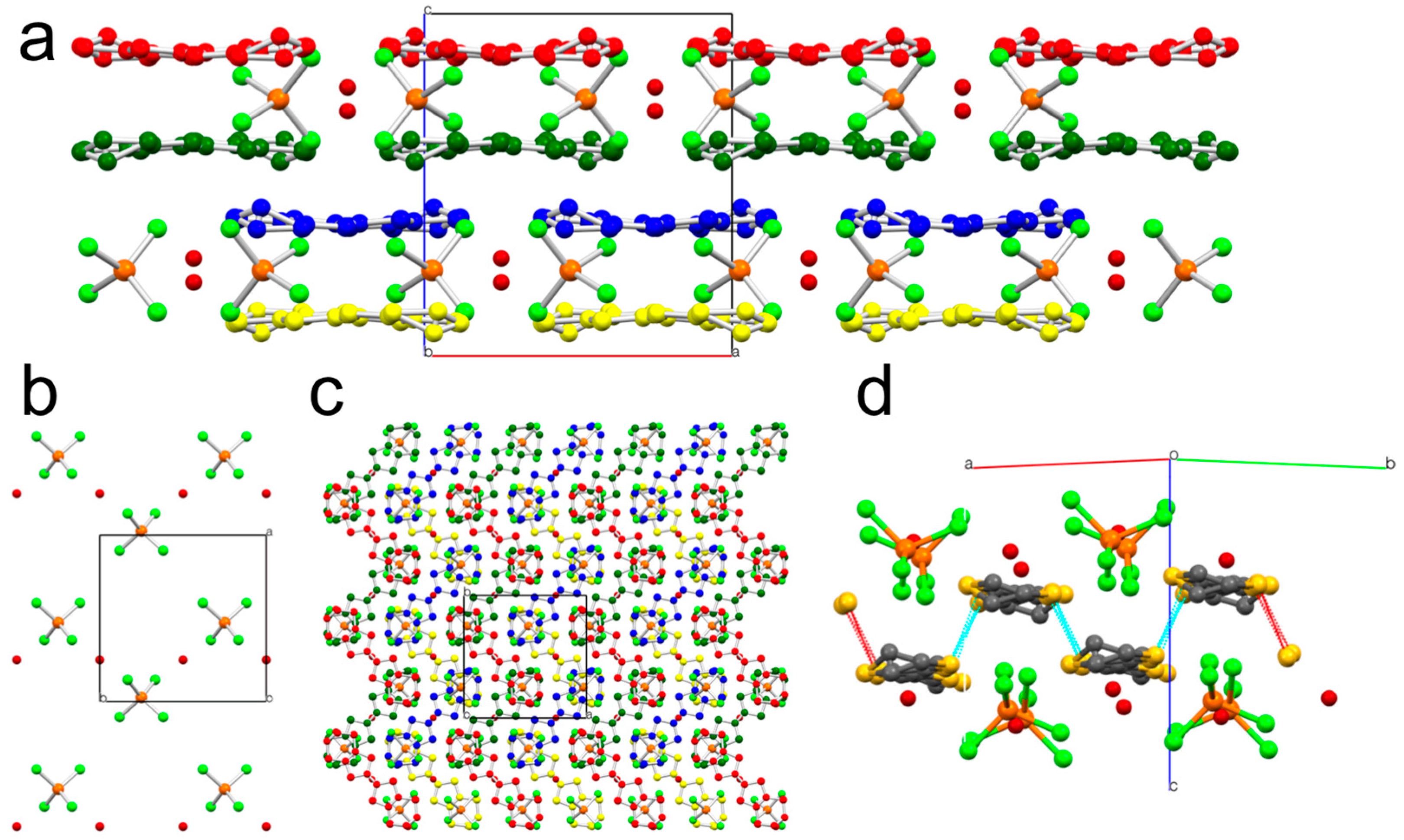 Structure of compound 2: (a) view of the cationic and anionic layers alternating along the c direction in 2. Green and blue (or red and yellow) ET molecules form one double layer; (b) view of the anionic layer; (c) view of two consecutive double ET and anionic layers down the c direction; (d) view of the zigzag chains in the ab plane showing the short S···S intermolecular contacts.