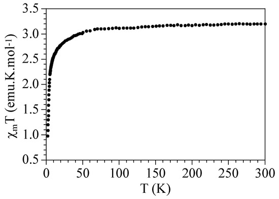 For compound 2, the χmT product per [MnCl4]2− anion shows a value of ca. 4.5 cm3·K·mol−1, close to the expected one (4.375 cm3·K·mol−1) for an S = 5/2 isolated Mn(II) ion with g = 2 (Figure 7). When the sample is cooled, χmT shows a progressive decrease to reach a value of ca. 1.0 cm3·K·mol−1 at 2 K. This behaviour indicates that compound 2 presents a weak antiferromagnetic coupling that might be attributed to a relatively short intermolecular Cl···Cl contact (4.877 Å) or to the short O–H···Cl H-bonds present in the anionic layer. Note that weak antiferromagnetic couplings through Cl···H–N contacts with similar distances have already been observed and confirmed with theoretical calculations [72]. Accordingly, we have fit the magnetic properties to a simple Curie–Weiss law [χ = C/(T − θ)] in order to estimate the weak magnetic coupling in 1. Thus, the χm−1 vs. T plot can be fit in the 30–300 K range with a Curie constant, C = 4.57 cm3·K·mol−1 and a Weiss temperature, θ = −9.4 cm−1 (solid line in insert in Figure 7), confirming the presence of a weak antiferromagnetic coupling. As in 1, we do not observe any magnetic contribution of the cationic lattice, suggesting that, as expected, the ET2+ cations are diamagnetic.