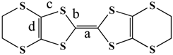 The estimation of the charge on the ET molecules in compound 1 using the formula proposed by Guionneau et al. [65] gives values of ca. +1 and ca. 0 for A- and B-type ET molecules (Table 7), respectively, as also found in all the reported orthorhombic (ET)4[AM(C2O4)3]·G phases [7,32,34,47,51].