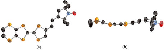 In the field of molecular conductors, much interest has been focused on the development of magnetic conductors, which simultaneously exhibit conducting properties of organic layers of π-electron donors and magnetic properties of inorganic layers of magnetic transition metal anions. In such conductors, the conducting properties of organic layers can be controlled by the application of external magnetic fields and several peculiar physical phenomena such as field-induced superconductivities in the λ- and κ-type BETS salts with FeX4− anions (BETS = bis(ethylenedithio)tetraselenafulvalene; X = Cl and Br) [,,] and anomalies of magnetoresistances corresponding to the spin-flop transitions of magnetic Fe3+ spins [,] have been yielded through the π-d interaction between the π-electrons of the organic layers and the magnetic d spins. On the other hand, the studies on molecular conductors using donor molecules substituted with stable organic radicals such as 2,2,6,6-tetramethylpiperidin-1-yloxyl (TEMPO) and nitronyl nitroxide radicals have been performed by several research groups [,,,] because cation radical salts of such stable radical-containing donors are expected to have strong intramolecular magnetic interactions between their π-cation radical spins and stable radicals and to show outstanding responses to the application of external magnetic fields []. Among them, we have also reported several tetrathiafulvalene (TTF)-based donor molecules containing stable organic radical parts such as TEMPO and 2,2,5,5-tetramethylpyrrolidin-1-yloxy (PROXYL) radicals [,,], and discovered highly conducting cation radical salts using bis-fused TTF (TTP = 2,5-bis(1,3-dithiol-2-ylidene)-1,3,4,6-tetrathiapentalene) donors and a PROXYL radical [,,]. Furthermore, we have developed new TTF and TTP donors containing a 2,2,5,5-tetramethylpyrrolin-1-yloxyl radical [] because this radical part has an unsaturated 3-pyrroline ring with a C=C bond and smaller steric hindrance in comparison to the PROXYL radical having a saturated 3-pyrrolidine ring. However, conducting cation radical salts of these donors containing a 2,2,5,5-tetramethylpyrrolin-1-yloxyl radical could not be obtained probably due to the steric bulkiness of the radical part that is connected almost orthogonally to the ethylenedithio bridge of these donor molecules []. Therefore, to minimize the steric bulkiness of this radical part, we designed a new ethylenedithio-tetrathiafulvalene (EDT-TTF) molecule containing a 2,2,5,5-tetramethylpyrrolin-1-yloxyl radical through a π-conjugated vinylene spacer 1 because its π-conjugated hexatriene chain will ensure the coplanarity between the TTF and stable radical parts. In this paper, we will report the synthesis, electronic and crystal structures, and physical properties of new molecule 1. Furthermore, we will discuss the detail of X-ray single crystal structure analyses and magnetic properties of the FeCl4− and GaCl4− salts of molecule 1 prepared by an electrochemical oxidation method. Because the FeCl4− salt contains three kinds of spins, namely, the π-cation radical spins of the donor parts, the stable organic radicals and the Fe3+ d spins, the magnetic interactions between these spins are of special interest.
