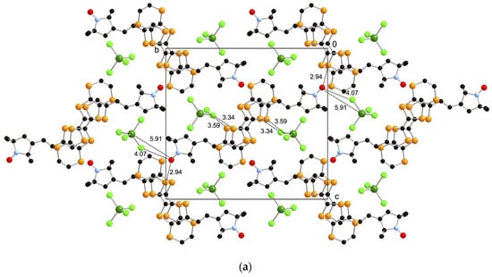 X-ray crystal structure analyses were performed on needle-like single crystals of the FeCl4− and GaCl4− salts of donor 1, 1·FeCl4 and 1·GaCl4 obtained by galvanostatic oxidation in the mixture of dry 1,2-dichloroethane and dry ethanol (v/v = 1:9) using the tetraethylammonium salts of the counteranions as supporting electrolytes. Because these two crystals belong to the monoclinic P21/n space group and are completely isostructural to each other, only the structure of 1·FeCl4 will be discussed in detail in this section. In the unit cell, one donor 1 and one anion moiety are crystallographically independent, indicating that the donor:anion ratio of these crystals is 1:1 and each of the donor moieties is in the monocation radical state 1+·. The ORTEP drawings of the molecular structure and the crystal structures of 1·FeCl4 are shown in Figure 4 and Figure 5, respectively. As shown in Figure 4, the molecular structure of the donor moiety of 1·FeCl4 is similar to that of the neutral one (Figure 2), but is more planar with a dihedral angle of 15° between the EDT-TTF moiety and radical moiety than that of the neutral one (26°). Furthermore, the TTF framework has quite high planarity with a mean deviation from the least-squares plane of 0.027 Å due to its +1 oxidized state. As shown in the crystal structures (Figure 5), two donor molecules form a dimer in a head-to-tail manner with a very short interplanar distance of 3.41 Å in the dimer (interaction a1; the shortest S–S contact is 3.44 Å). The dimers construct a one-dimensional stacking structure along the a-axis with a longer interplanar distance of 3.63 Å between the dimers (interaction a2; the shortest S–S contact is 3.93 Å). Overlap integrals between the donor moieties along these stackings, which are calculated by the extended Hückel method [], are a1 = 41.5 × 10−3 and a2 = 0.29 × 10−3, indicating its quite strongly dimerized one-dimensional electronic structure. On the other hand, the anion moiety locates on the side of the dimers with very short S–Cl contacts of 3.34 Å (interaction I) and 3.59 Å (interaction II), suggesting very strong π-d interaction between the donor and anion moieties. These anions form a uniform one-dimensional array with a relatively long Cl–Cl contact of 3.90 Å (interaction dd1) along the a-axis, suggesting weak direct intermolecular interaction between the anions. Furthermore, the oxygen atom of the stable radical part has a short O–S contact of 2.94 Å with the neighboring EDT-TTF moiety as shown in Figure 5a.