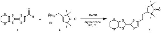 The EDT-TTF molecule containing a 2,2,5,5-tetramethylpyrrolin-1-yloxyl radical 1 was prepared as described in Scheme 1. The Wittig reagent of stable radical part 4 was prepared by the reported method from the corresponding bromomethyl derivative 3 [], and was reacted successively with t-BuOK and formyl-substituted EDT-TTF 2 [] in dry benzene at room temperature. After the column-chromatographic separation of the resultant mixture, donor molecule 1 having a vinylene spacer was obtained as air-stable orange microcrystals in 53% yield.
