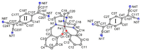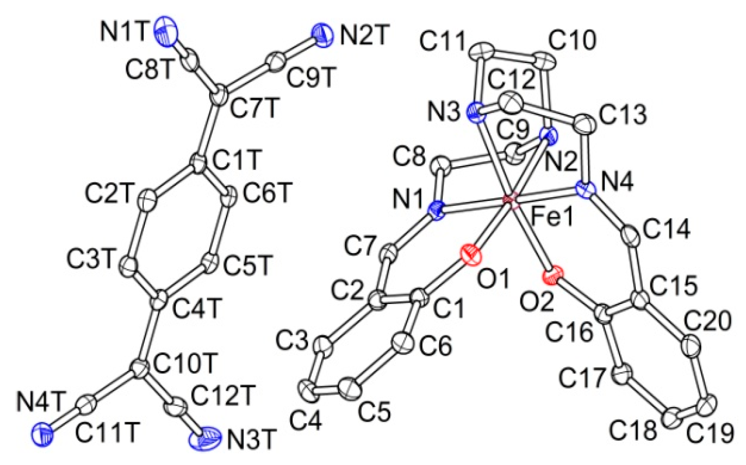 The asymmetric unit of the triclinic P unit cell at 100 K includes one TCNQˉ anion, one [Fe(sal2-trien)]+ cation and one acetonitrile molecule in general positions (Figure 5).