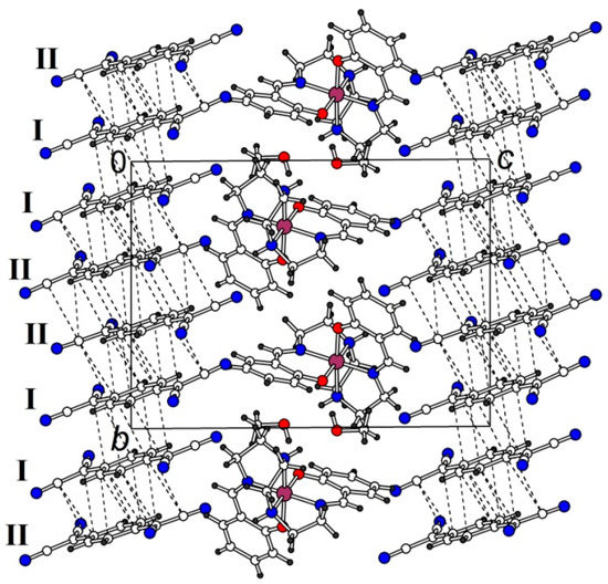 In the 100 K structure, charge state of both independent TCNQ•δ− radical anions I and II is slightly different and close to −0.4 and −0.6, respectively, according to calculations on the base of intramolecular bond lengths using Kistenmacher’s empirical formula [41] (Table S1). π-stacking of TCNQ anions leads to a formation of infinite stacks along the [10] direction. The stacks are composed of tetrads …-(II-I-I-II)-(II-I-I-II)-… (Figure 2) with ring-over-bond overlap inside the tetrad due to longitudinal shift of adjacent anions and ring-over-ring one between the tetrads (longitudinal shift is absent, Figure S4). Interplane separations in the stack at 100 K are 3.274(4) Å (I…I), 3.19(4) Å (I…II) and 3.297(6) Å (II…II), the angle between mean planes of I and II is 2.37(5)°. There are a lot of intrastack C…C contacts shorter than 3.4 Å, while adjacent stacks interact only by weak hydrogen contacts of С–Н…N type with H…N distances of 2.58–2.73 Å.