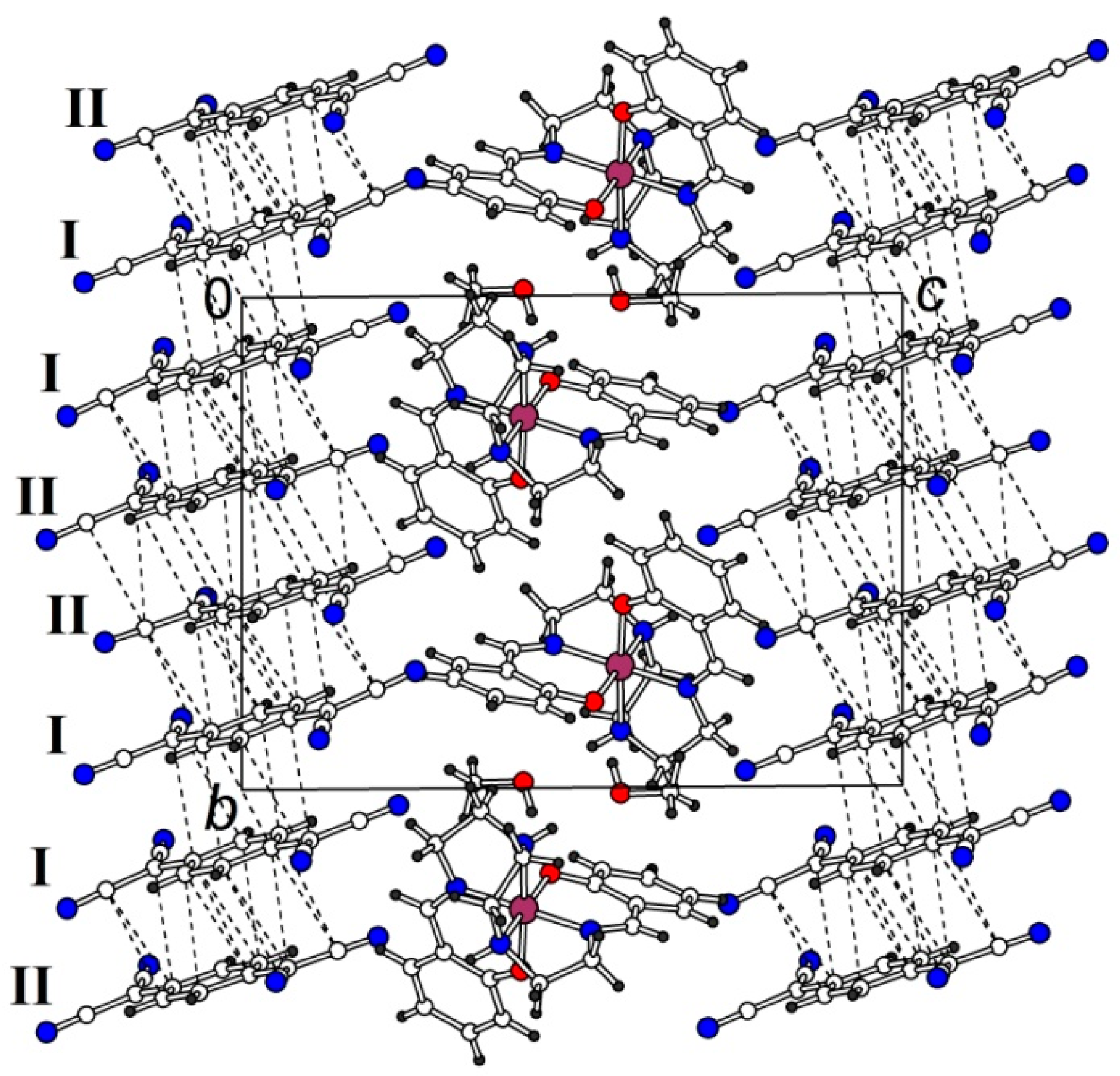 The structure of 1·MeOH has been investigated at several different temperatures between 100 and 385 K. The asymmetric unit of the triclinic P unit cell of initial 1·MeOH crystal includes two independent TCNQ•δ− radical anions (denoted as I and II), one [Fe(sal2-trien)]+ cation and one methanol molecule in general positions (Figure 1). The crystal structure consists of layers of TCNQ radical anions parallel to the ab-plane which alternate with mixed Fe(sal2-trien)-solvent layers along the c-axis (Figure 2).