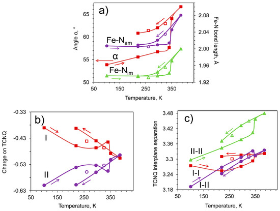 Symmetry of the crystal (triclinic P) persists upon the transition, but solvent loss causes significant distortion of the lattice (Materials and Methods). Relatively large temperature-dependent structural changes have been found in both cationic magnetic and anionic conducting layers. They are accumulated in Table 1 and Figure 4. All the structural parameters investigated show discontinuous changes between 340 and 350 K at the transition from solvate to solvent-free phase. In the magnetic subsystem, the Fe–N bond lengths and dihedral angle α between two phenoxy groups in the [Fe(III)(sal2-trien)]+ cation, both of which are sensitive to spin state of the complex, show linear temperature dependences in the 100–340 K range and notably increase at 350 K (Figure 4a). An abrupt growth of these parameters reflects transition of Fe(III) from LS (S = 1/2) to HS state (S = 5/2). The mean Fe–Nimine and Fe–Namine bond length values increase from 1.94 and 2.01 Å, typical for the LS Fe(III), to 2.00 and 2.08 Å, respectively, at 385 K. Taking into account corresponding average Fe–N distances in high-spin state, 2.12 and 2.20 Å [26,34], one can presume that about one third of iron centers are HS at this temperature. Stronger distortion of the FeN4O2 octahedron at 385 K (diagonal angles are 164°–177°, Table S2) is an additional evidence of partial transition to HS state. It should be emphasized that in the temperature range 100–340 K, in which the solvate phase 1·MeOH exists, the Fe–N bonds correspond to LS state and do not show any notable growth. In the solvent-free phase 1 a reversible character of SCO transition is observed at further temperature cycling. The Fe–N bond lengths return to initial, typical for LS Fe(III) values on cooling to 220 K and go again to HS values on a new cycle of warming (empty marks in Figure 4a) but in the phase 1 these changes are smooth, without jump. The angle α in 1 at low temperatures is larger than it was in 1·MeOH (Figure 4a) reflecting appearance of an additional space in the crystal lattice of the solvent-free phase.