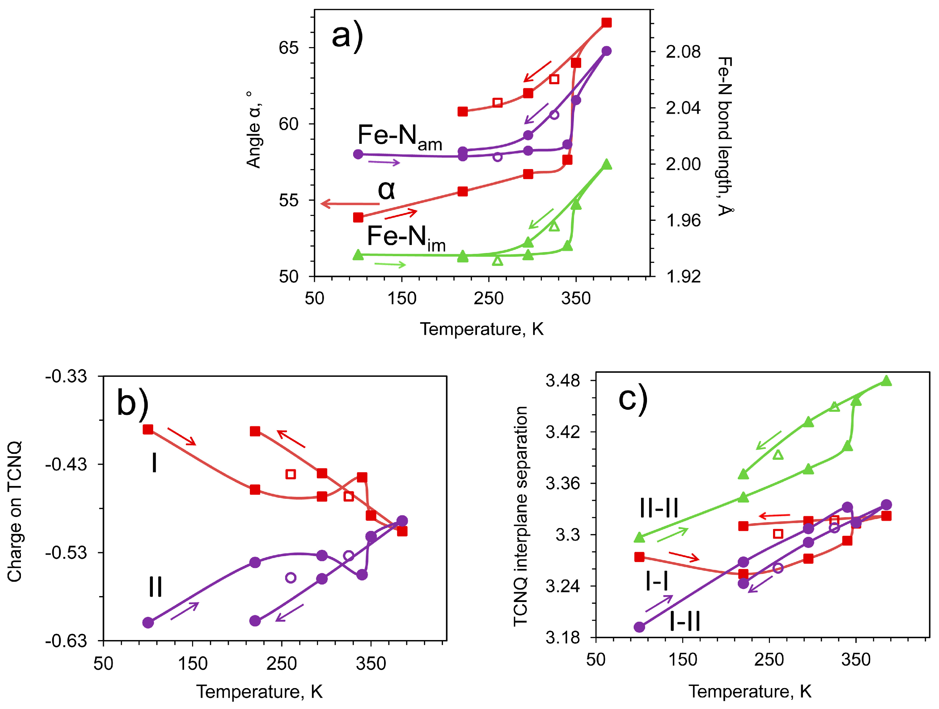 Temperature dependences of mean Fe–Namine and Fe–Nimine bond length values and dihedral angle α between two phenoxy arms in the cation (a); TCNQ•δ− I and II charges (b) and interplane separations I-I, I-II and II-II in TCNQ stack (c). Starting point was at 100 K, warming from 100 to 385 K was followed by cooling from 385 to 220 K (see arrows) and new warming from 220 to 325 K (points corresponding to second warming are shown by empty marks). The data points obtained while warming in the range 100 K to 340 K belong to the solvate phase 1·MeOH. The parameters obtained while warming above 350 K and further cooling correspond to the solvent-free phase 1.