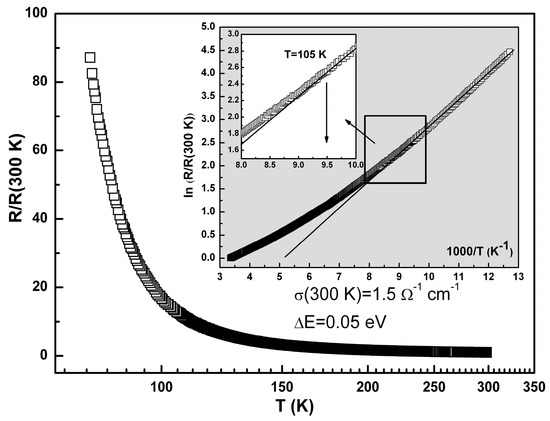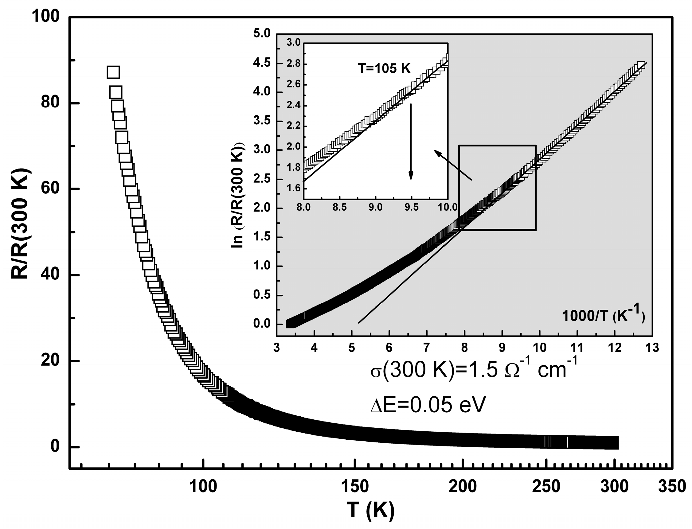 Temperature dependence of the normalized resistance, R(T)/R(300 K) for 1·MeOH, in the logarithmic scale. Inset—the plot of R(T)/R(300 K) vs. scaled reciprocal temperature, 1000/T. Solid line is the best fit curve in the range 78 K < T < 110 K, Rtheor(T) = exp(ΔE/kT), with the energy gap ΔE = 0.05 eV. Zoomed window—a deviation of the experimental data from the theoretical curve starting above 105 K.