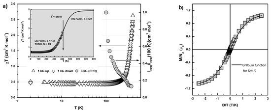 The bulk static magnetic susceptibility χ of 1·MeOH was measured on a polycrystalline sample in the temperature range of 2–400 K (Figure 7a). The entire range was scanned twice at rates 5 K/min in the interval 20–400 K and 0.5 K/min at the interval 2–20 K. The exposure time at the highest temperature 400 K was 10 min. Two cycles of measurements at external field values 0.1 T and 4.0 T provided coinciding data points above 20 K. The data of the latter cycle were omitted in Figure 7. The value of spin response below 100 K indicated that ~98% of Fe(III) ions exist in LS state. Spin response of conducting TCNQ sublattice appeared to be negligible within less than 10% (χ ≤ 2 × 10−2 cm3·K·mol−1) [42,43]. This is in agreement with earlier measured spin response of TCNQ layers in conducting Fe(II) SCO system [40]. A temperature independent contribution (TIP) to the spin susceptibility was also found insignificant for the description of the low temperature evolution of χ(T) in Figure 7a. A total magnetization, M(B), measured at 2 K (Figure 7b), was described by a Brillouin curve for S = 1/2 (solid line). Thus, a paramagnetic response of 1·MeOH below 100 K is related to the local moments S = 1/2 of LS Fe(III).