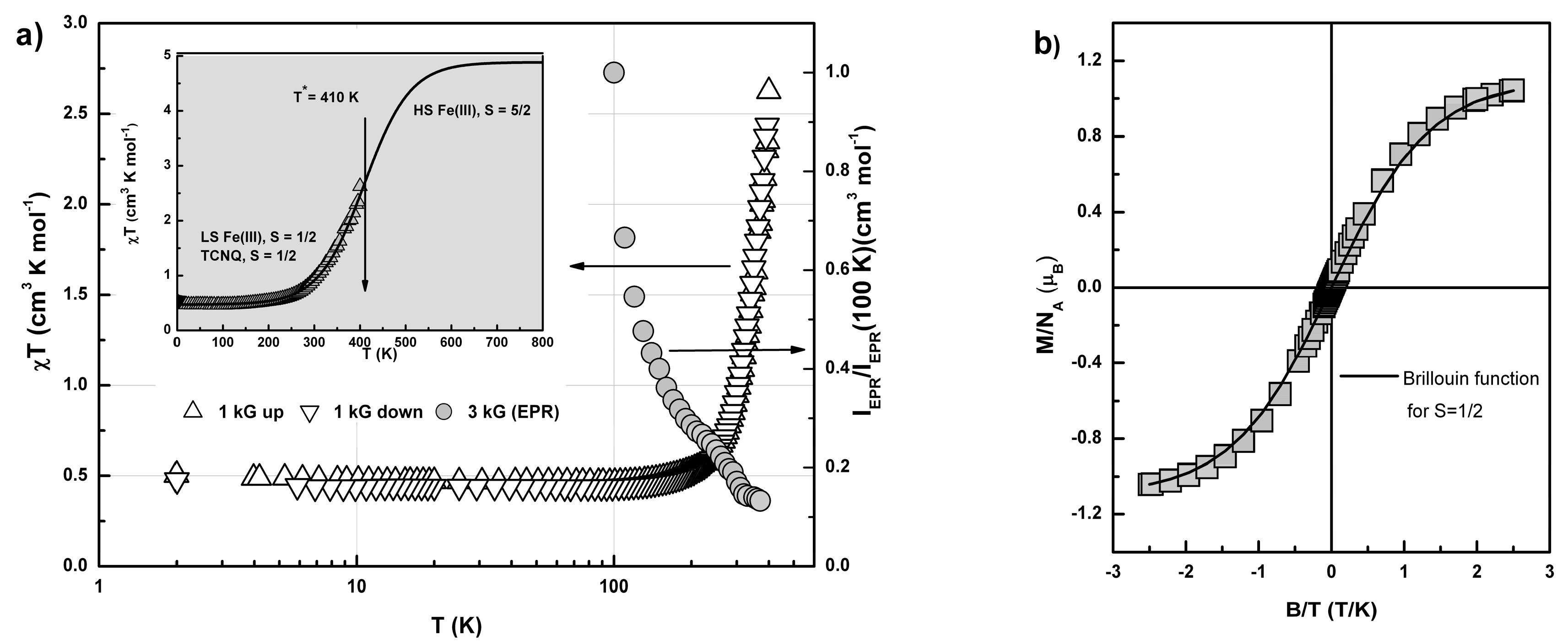 Temperature dependences (logarithmic scale) of the product χT measured for 1·MeOH by SQUID magnetometer (B = 1 kG, heating (Δ) and cooling (∇) regimes) and the relative spin concentration IEPR(T)/IEPR(100 K) measured by EPR (B = 3 kG, heating (●) regime) (a). Inset—detailed evolution of the χT in the range of spin crossover transition between LS Fe(III) S = 1/2 and HS Fe(III) S = 5/2. Solid line is a simulation by a Boltzmann distribution. Field dependence of the magnetization, M(B), measured at T = 2.0 K (b). Solid line denotes the Brillouin function for S = 1/2.