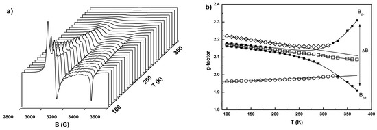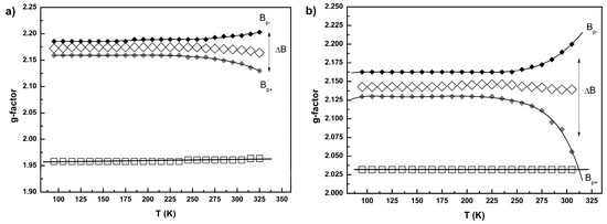 Temperature dependences of the g-parameters for 2 (a) and 3 (b) extracted from LS Fe(III) EPR signal while measurements in heating regime: g⊥ (◊), g|| (□). Solid lines connecting squares (■) fit the positions of the peaks Bp+ and Bp− for simulation the partial spectral line corresponding to g⊥, ΔB = Bp+ − Bp− .