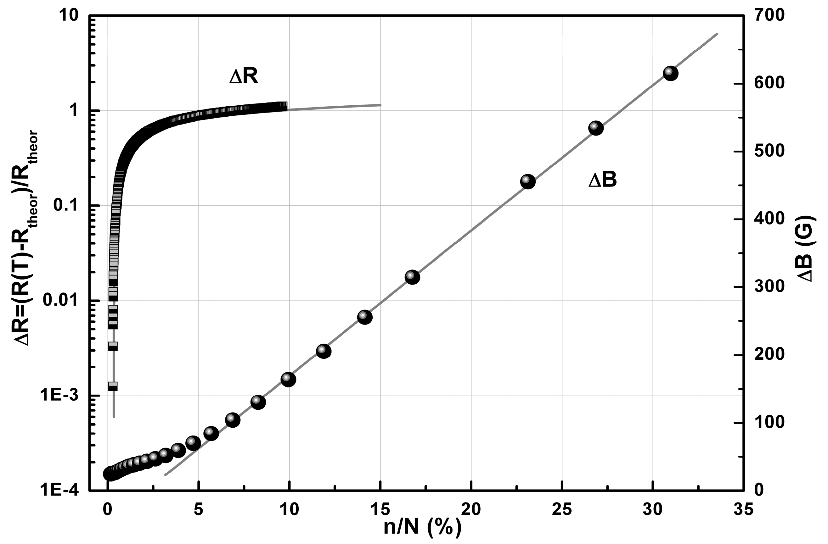 Partial EPR linewidth in 1·MeOH corresponding to the central g2 component of g-factor (●), ΔB, vs relative concentration of [Fe(III)(sal2-trien)] complexes in HS state, n/N(%). Solid line is the best fit curve ΔB = ΔB0 + k(n/N), where │ΔB0│ = 46 G, k = 21 G/%. Relative deviation of the resistance (■), ΔR = (R(T) − Rtheor(T))/Rtheor(T), measured in the range 107 K < T < 300 K vs. the concentration n/N(%). Solid line is the best fit logarithmic curve ΔR(n/N) = A·ln(3n/N), where A = 0.3. The values n/N(%) were extracted from the modeling transition curve in Figure 7a (inset).