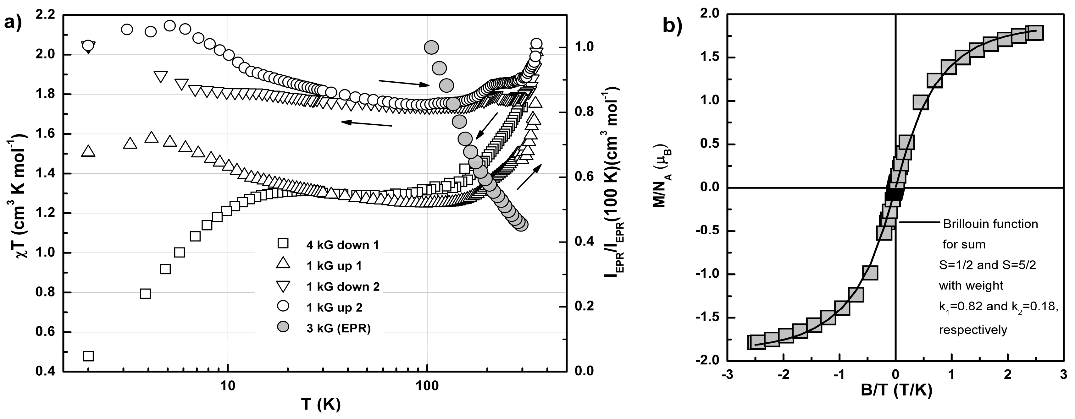 Temperature dependences (logarithmic OX scale) of the product χT for 2 obtained in two heating-cooling cycles (B = 1 kG, cycle 1: cooling (□), heating (Δ); cycle 2: cooling (∇) and heating (○)) and the relative spin concentration of S = 1/2, IEPR(T)/IEPR(100 K), measured by EPR (B = 3 kG, heating (●) regime) (a). Field dependence of the magnetization, M(B), for 2 measured at T = 2.0 K (b). Solid line is the best fit curve corresponding to a weighted superposition of Brillouin functions for S = 1/2 and S = 5/2 (see main text for details).