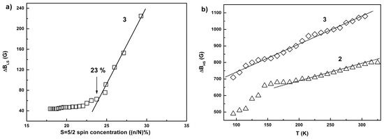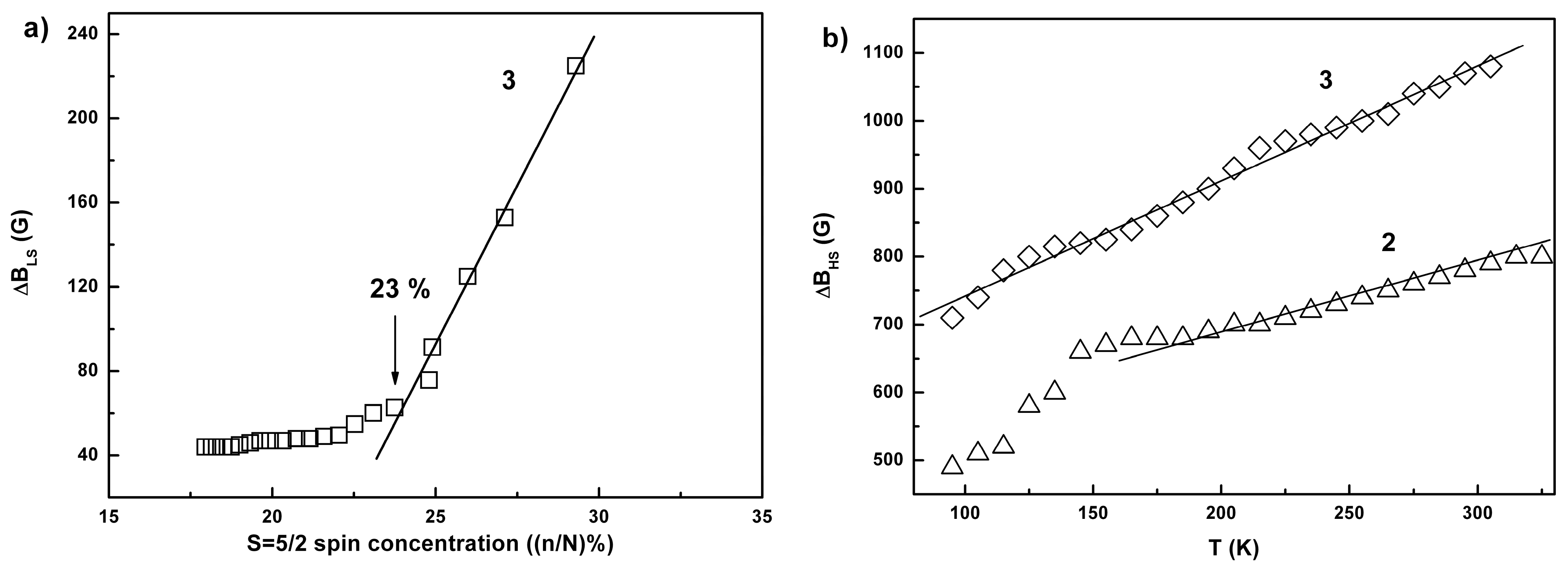 EPR linewidth, ΔB, associated with g⊥ component of the total spectrum in 3 vs. concentration of the local moments S = 5/2, n/N(%) (a). Solid line is the best fit function for n/N > 23%, ΔBLS = ΔBLS0 + k(n/N), where │ΔBLS0│ = 6.60·102 G and k = 30.1 G/%. Temperature dependences of the EPR linewidth for the high-spin moments, S = 5/2, ΔBHS(T) (b). Best-fit lines are given by the expression ΔBHS = ΔBHS0 + kHS·T, where ΔBHS0 = 5.66·102 G, and kHS = 1.7 G/K for 2, and ΔBHS0 = 5.09·102 G, and kHS = 0.91 G/K for 3.