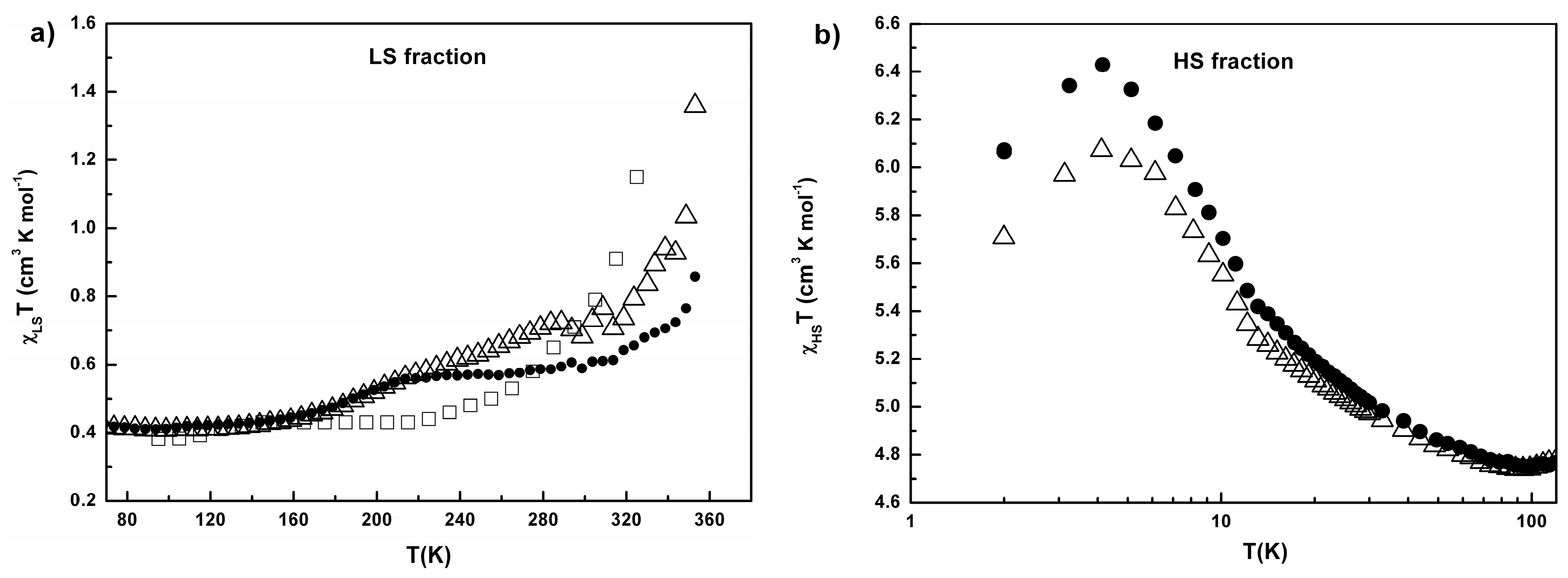 Temperature dependences of the product χLST for the LS (SCO) fraction in 2 (measurements in heating regime, cycle 1 (Δ), cycle 2 (●)) (a). Temperature dependence of the EPR linewidth for g⊥ component measured at heating in cycle 1 (□). Temperature dependences of the product χHST for the HS (residual) fraction (b).