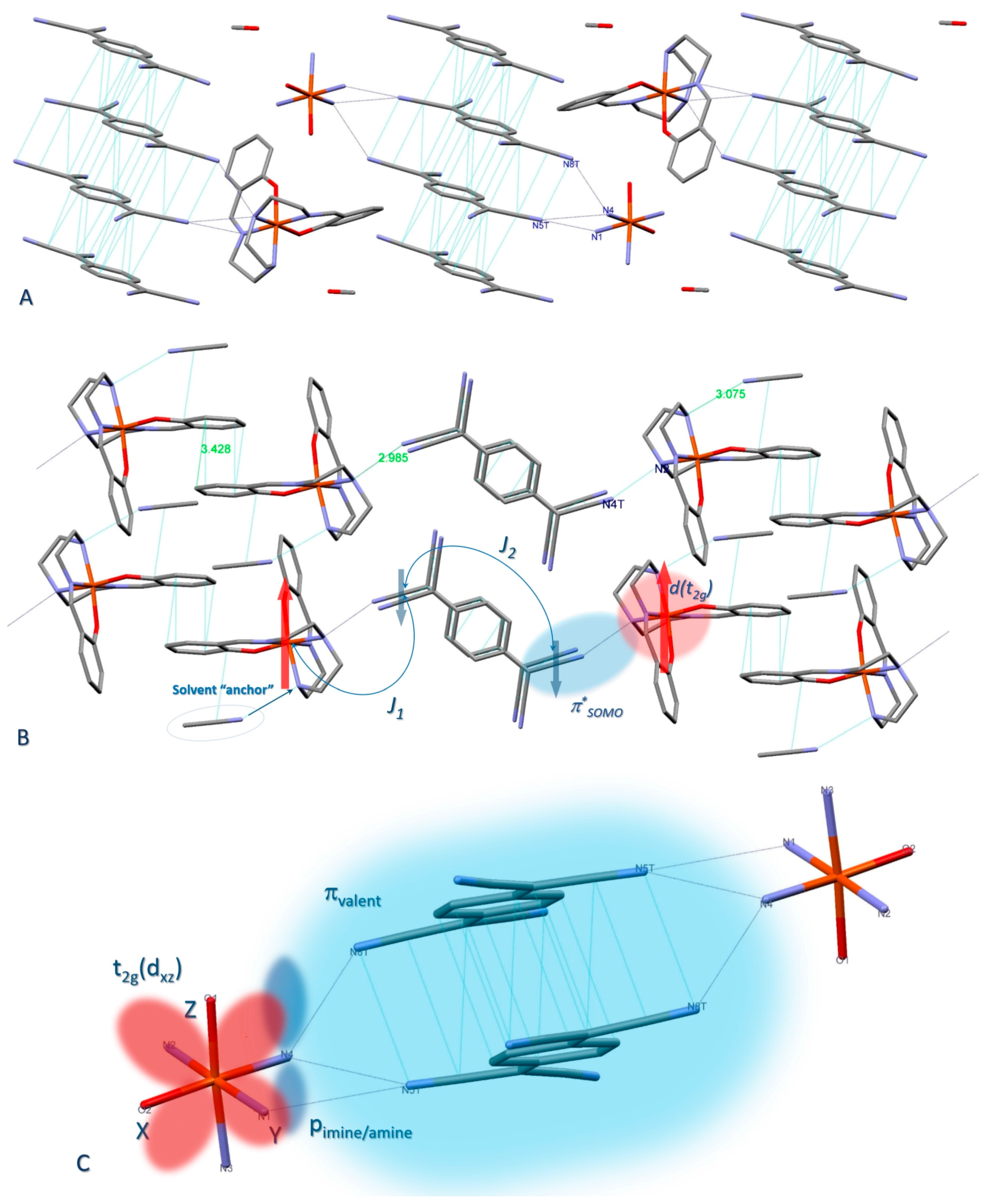 Schematic structural arrangements of the TCNQ molecules and [Fe(sal2-trien)]+ cation complexes in 1·MeOH (A) and 2 (B). Dotted lines represent N…N, C…C short contacts of less than the sum of the van der Waals radii; (C) Mutual arrangement of coordination Fe(III) octahedra with neighbor TCNQ units II in 1·MeOH. Orbitals are presented schematically.