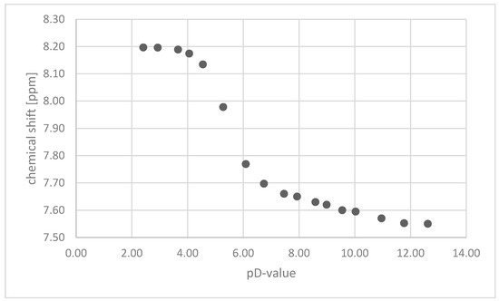 The collected 1H NMR data were processed and plotted against the pD values (i.e., value related to pH in D2O) (Figure 4). The curves obtained can be compared to regular titration curves. If so, the pKa can be determined as the equivalence point by titration, as determined using a concentrated arc method (Tubbs’ method, [16]) or as the first derivation of the function (Excel). Therefore, the determined point can be recalculated using Equation (7) (cf. Supporting Information Chart S1). Working with undergraduate students applying of graphical method has advantages as they usually do not have a lot of experience in creating charts. The pH* is measured with a glass electrode upon the addition of either the KOH-solution or the HCl-solution. All experimental details and data can be found in the supporting information.