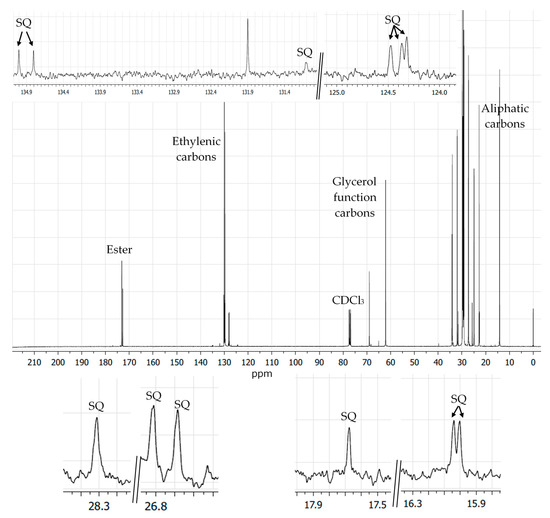 13C NMR spectrum of a commercially available virgin olive oil. SQ: squalene.
