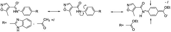 Amides 2–4 and 6 exert the same sign for angle Ө between carbonyl and isoxazole or aromatic ring like leflunomide (cis relation between isoxazole and aromatic rings). While, 5 and 7–13 exert one opposite signs (trans relation between isoxazole and aromatic rings) as shown in (Table 2). In compound 6, N is imidic so the lone pair of electrons are delocalized over 2 C=O groups and thus the aryl protons are more deshielded.