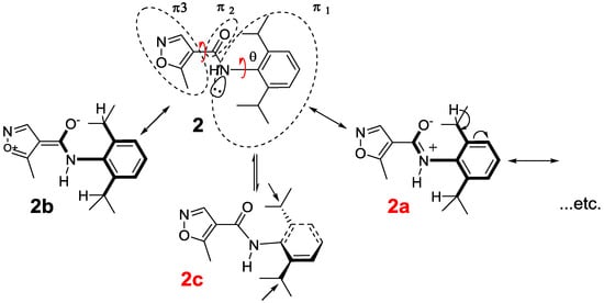 The compound (2) has three different systems. The 2 can be conjugated with 1 as anilide (2a), loss of conjugation between nitrogen and aryl leads to the fact that the compound behaves as amide rather than anilide due to the bulky ortho 2,6-diisopropyl groups, or 3 as carbonyl moiety (2b), very unstable, has possibility of diverse dipolar interactions (Figure 3).
