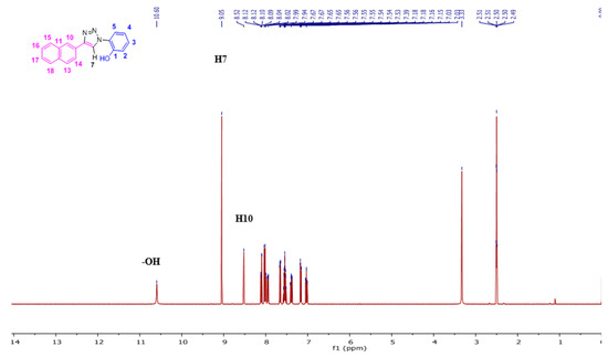 The NpTP structure was characterized by 1H-NMR in various deuterated solvents such as acetonitrile-d3 (CD3CN), dimethylsulfoxide-d6 ([(CD3)2SO]), and acetone-d6 [(CD3)2CO]. Figure 1 shows the comparison between the three solvents. The aromatic peaks in these solvents appear in the range of δ 7.00 to 9.05 ppm with anticipated coupling patterns. The triazole Csp2–H (H7) proton singlet, as expected, is highly deshielded and hence is a reference peak in many studies (δ 9.05 ppm in DMSO; δ 9.00 ppm in acetone, and δ 8.78 ppm in acetonitrile) [41,50]. The H5 proton has noticeably shifted its position in all three solvents, with acetone being highly downfield (δ 7.82 ppm as doublet of doublets in acetone-d6). The naphthyl core has seven resonance signals; the singlet at δ 8.52 in DMSO-d6 is easily identified as the H10 proton. The H14 and H13 proton split as a doublet (δ 8.11 ppm and δ 8.00 ppm, respectively). The phenolic –OH proton is visible as a broad singlet in DMSO-d6 at δ 10.60 ppm (Figure 2 and Figure S1). The correlational spectroscopy (g-COSY) studies helped in assigning all the aromatic protons. A strong meta coupling (4J) cross peak of the H10 and H14 proton is visible and is marked below in Figure 3.