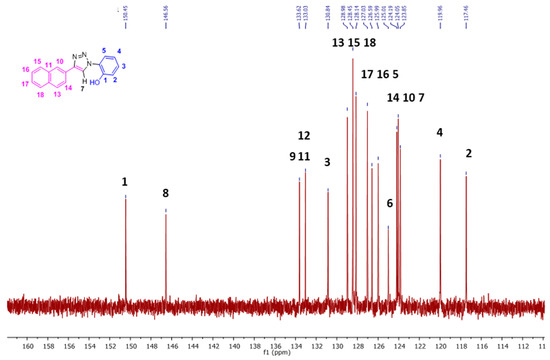 The 13C-NMR spectrum (100 MHz, (CD3)2S=O, RT) showing the expansion from δ 110–162 ppm of NpTP. (For the full version, see Figure S2.)