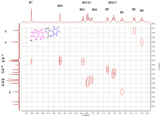 The 13C-NMR signals (Figure 4, Figures S2 and S3) for the aromatic region ranged from δ 117.5 to 150.5 ppm in DMSO-d6. With the help of 1D DEPT 90 (Figure S4) and 2D HSQC (Figure 5), all the single bonded carbon hydrogen correlations were marked. The HMBC studies (Figure S5), aided in allocating the quaternary carbons (1, 6, 8, 9, 11, and 12). The strong peaks for example seen for C1 carbon are for H5 and H3 protons through three bond correlations and the weak peak is seen for H2 proton via two bond correlation. Both the 1D and 2D studies guided in assigning the 1H and 13C resonances for the NpTP molecule.
