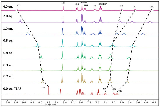 Changes in partial 1H-NMR (400 MHz) spectra of NpTP (6.2 × 10−2 M) in CD3CN upon increasing equivalents of TBAF (0 to 4.0 eq.).