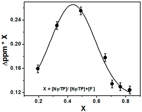 The titration experiments also helped to find the binding stoichiometry of the sensor with the F− ions through Job’s plot [54,55]. The change in the delta value of the triazole proton H7 (∆δ = δx − δo) at δ 8.78 [55] was plotted against the mole fraction of the sensor [NpTP]/([NpTP + TBAF]). The plot was fitted using the non-linear curve fit parameters of the ORIGIN 8.0 software. It showed a maximum intensity at 0.45 mole fraction, revealing the binding stoichiometry of F− ions to NpTP as 1:1 (Figure 7).