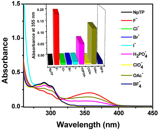 Absorption spectra and bars (in the inset) representing the spectral response of NpTP (~1 × 10−5 M) upon the addition of 4 × 10−4 M of various anions in acetonitrile. The bars in the inset are plotted by monitoring the absorbance of NpTP at 355 nm in presence of anions.