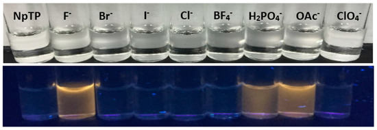 Color changes of NpTP under a UV lamp of long wavelength (365 nm) upon addition of ~2 × 10−2 M of anions to ~1 × 10−3 M sensor in acetonitrile.