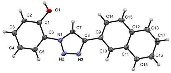 The structure has two independent NpTP molecules in the asymmetric unit that only differ in the orientation of the naphthyl ring to the triazole. The structure is held together by two independent hydrogen bonding chains with H-bond between the phenolic O–H and the triazole nitrogen of neighboring molecules. The first chain runs parallel to the a-axis (Figure S15), the second runs parallel to the b-axis (Figure S16). Combined, these form a network of hydrogen bonds that holds the overall structure together. The detail reports on NpTP crystal structure is provided in Table S1–S7.
