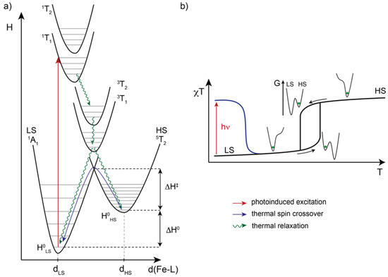Several stimuli have been used to trigger magnetic properties changes [3] in three main areas: (i) changing the spin state of a transition metal in spin crossover (SCO) systems [4,5,6,7,8,9,10,11]; (ii) switching the exchange interaction between different spin carriers [12,13]; and (iii) switching single-molecule magnet (SMM) properties [14,15]. Spin-crossover complexes [16,17,18,19,20] are particularly interesting for such purpose, as they can exist in two stable spin states and have been largely studied. Even if spin-crossover behavior is theoretically expected to occur in octahedral complexes with 3d4 to 3d7 electronic configurations, most spin-crossover complexes are based on Fe(III), Fe(II), and Co(II), with only few reported examples of compounds of Mn(II), Mn(III), Cr(II), and Co(III). The study of spin-crossover systems has originated from d6 Fe(II) complexes that can be reversibly switched between high spin (HS, S = 2) and low spin (LS, S = 0) states by using several stimuli [6,21]. The evolution of the magnetization of some Fe(II) complexes has shown a thermally induced spin crossover that is associated sometimes with a hysteresis loop (Figure 1b) [4]. The HS state, stable at high temperature, is converted to LS upon cooling. This effect has an entropic origin due to a higher number of microstate and vibrational entropy in the HS configuration [5]. Light can also be used at a low temperature to trigger a spin transition from LS to HS by a light induced excited spin state trapping (LIESST) effect (Figure 1a) [22,23]. In this case, an increase of the magnetization is observed upon irradiation at low temperature, indicating the population of the metastable HS state. However, by increasing the temperature, a drop in the magnetization is observed at temperatures where the thermal energy is enough to allow for a relaxation to the stable LS state [24]. Apart from temperature and light, chemical [25], electrical [26], or pressure [27] stimuli have also been used to induce a spin crossover.